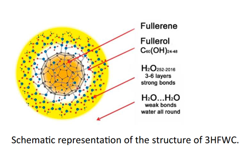 Hyperharmonized Hydroxygenized Hydroxylated Fullerene Water Complex (3HFWC) is a stable fullerene-water compound created using ultrapure water and fullerene, subjected to a strong oscillatory magnetic field. This process results in the robust bonding of hydroxyl groups to the surface of the fullerene C60 sphere. Simply put, 3HFWC consists of a fullerene C60 core, surrounded by hydroxyl groups (known as fullerenol), and encased in 3 to 12 ordered layers of water molecules.