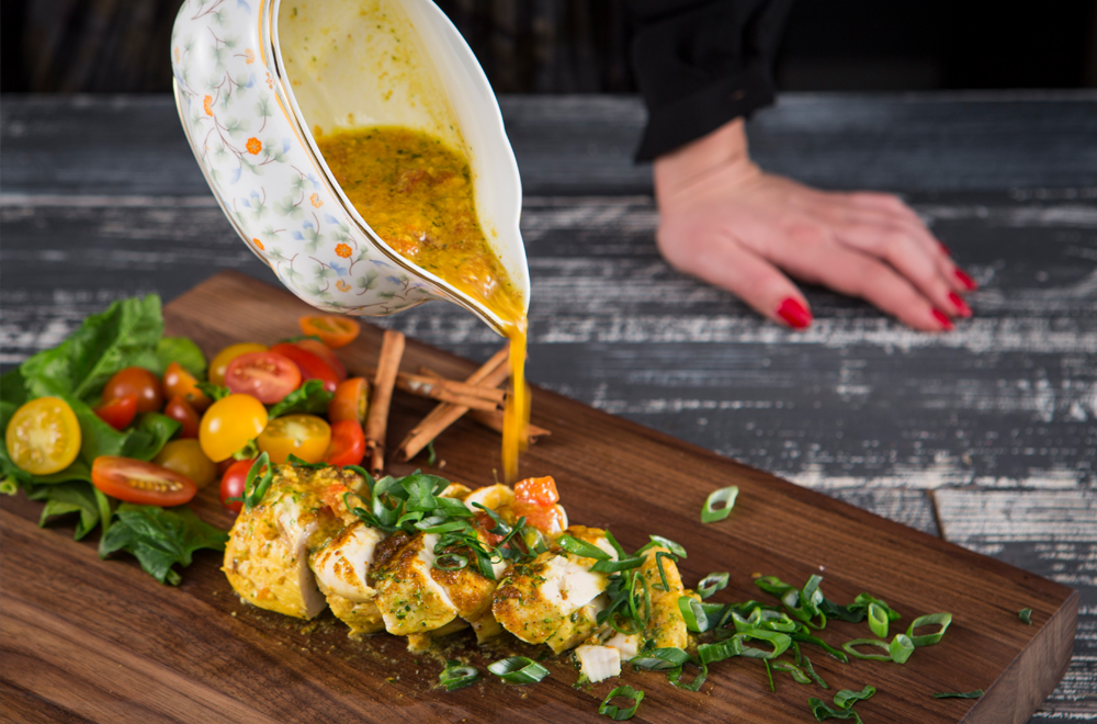 Put chicken fillet in a cold oval griller Z-V3025 without fat, add 5-spice mix and fresh rosemary, tomatoes, mustard, orange juice, cinnamon sticks and cover with a lid.