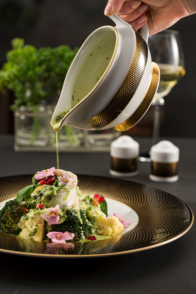 - Pour the pesto over the ready meal, serve it in Rio Black porcelain and add oil and pomegranate.