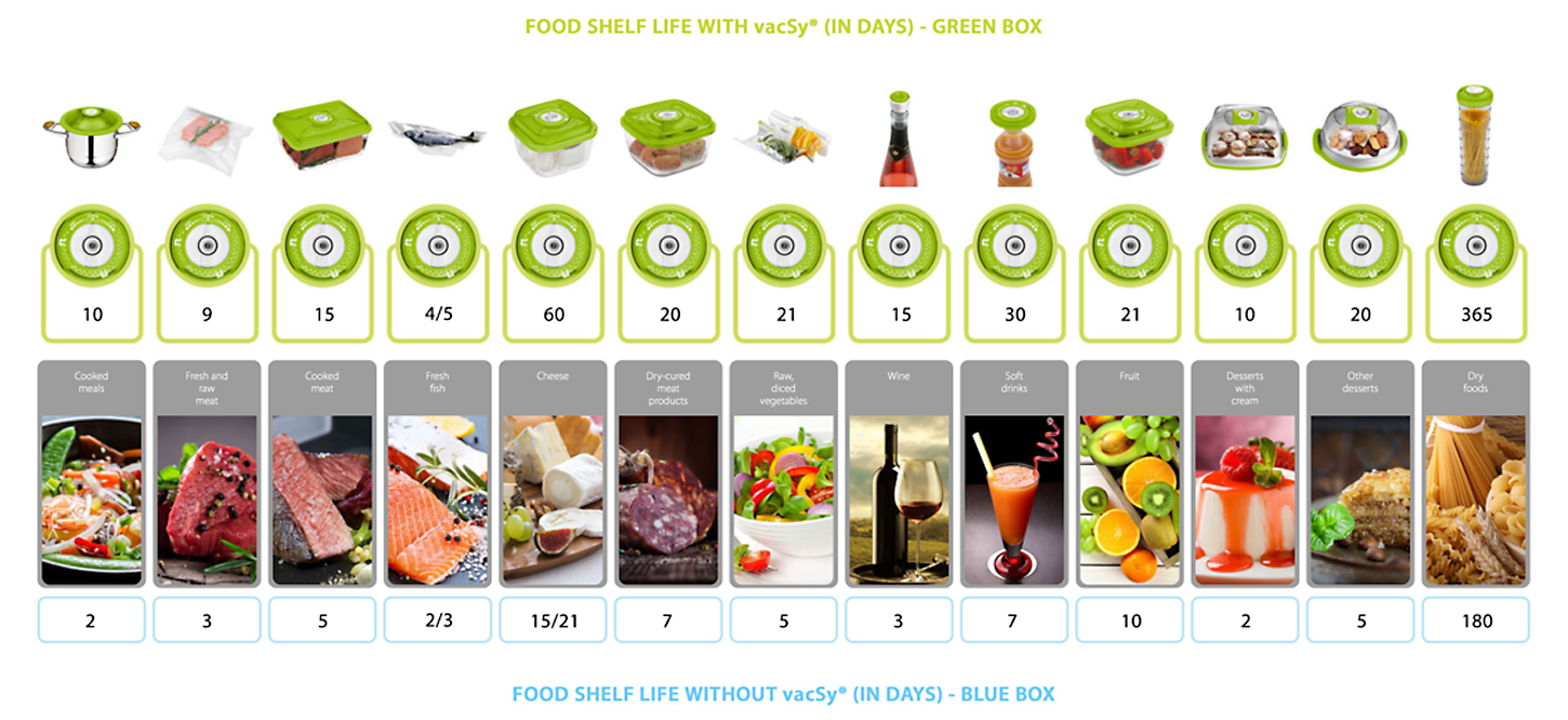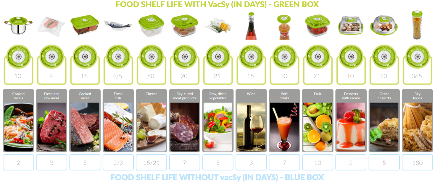 VacSy® is a worldwide-patented food vacuum system - designed to create a vacuum inside special glass containers and special air-tight bags. The vacuum environment deprives bacteria, moulds and fungi of the oxygen needed for survival and maintains the flavour and nutritional properties of the food in an unaltered state! Food stays fresh and healthy for up to 5 times longer than in the normal refrigerator conditions.
