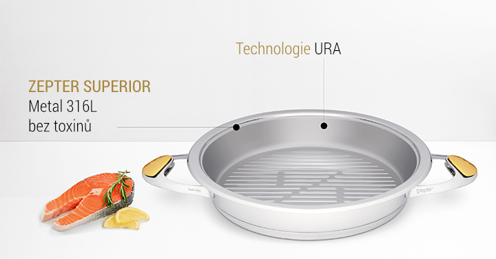 Zepter URA (Ultimate Resistant Application) je inovativní nepřilnavá technologie. Na povrch není nanášen žádný škodlivý nátěr, takže je bezpečný pro vaše zdraví.
