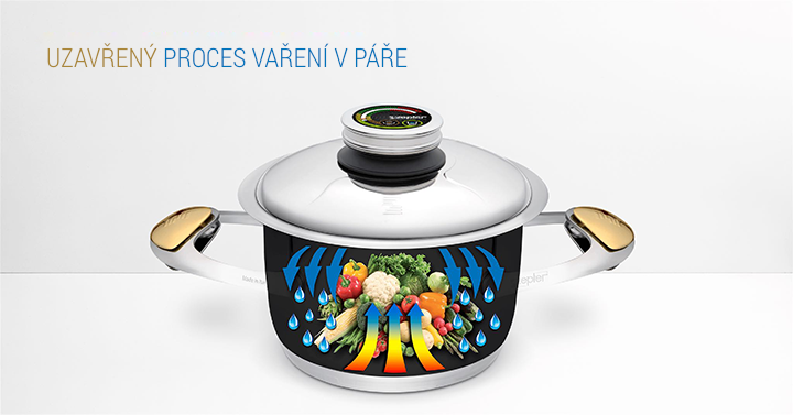 Speciálně navržené víko Zepter dokonale padne na okraj hrnce a hermeticky uzavře hrnec vodním uzávěrem, což umožňuje proces Zepter Closed Circle.